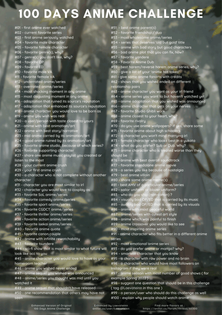 So Lolinia suggested I do that 100 day anime challenge, but make it harder with these limitations: No anime from the last 10 years and no Hata-sensei. This is definitely going to be a challenge, especially the 10 years since that removes a massive chunk of anime, but I’ll give it a shot and try to answer as many questions as I can.