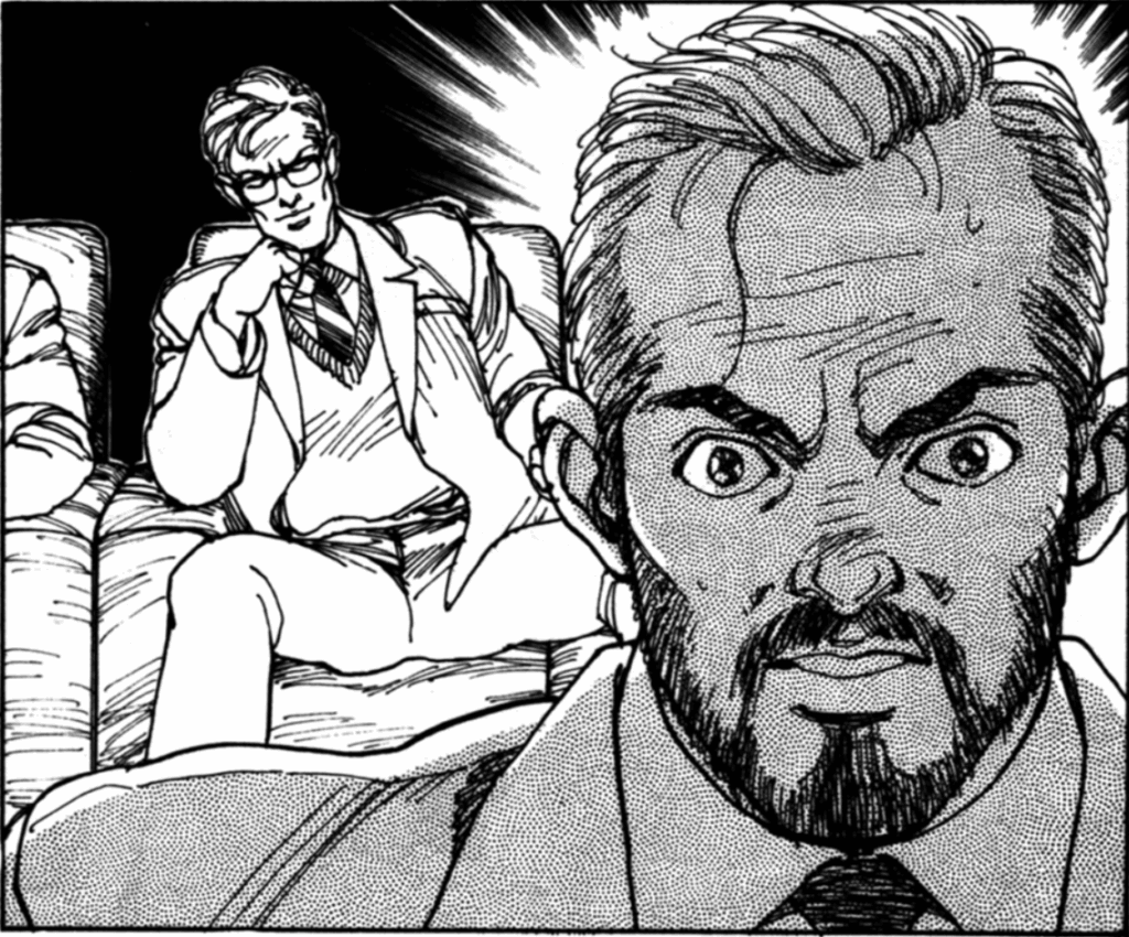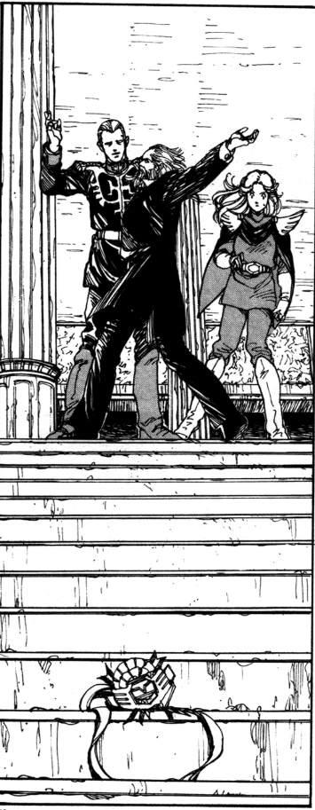 So next we skip to 1999 where Minovsky (now 16) is studying physics and his own Minovsky physics theory in America.  I also gotta point out real quick how this is taking place in 1999 when this oneshot was written in 1990, so the characters here have very 80s looks rather than 90s lmao.  Look at the 80s hair on this woman lmao.