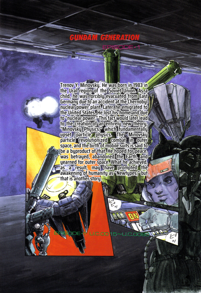 Alright, so this is the first page in the oneshot, and it has a lot of good information, so let’s break it down a little.  So we know that Minovsky was born in 1983 in the Ural region of the USSR.  If we look at the historical context of this, he was born in the later part of the Cold War.  1983 was during Reagan’s first term where the tensions between the US and USSR increased a bit before his more detente 2nd term.  During this time we’re well into the nuclear age lead by America and the Soviets.  By this point nuclear reactors were being used, and we’ve already had major nuclear accidents such as 3 mile island.