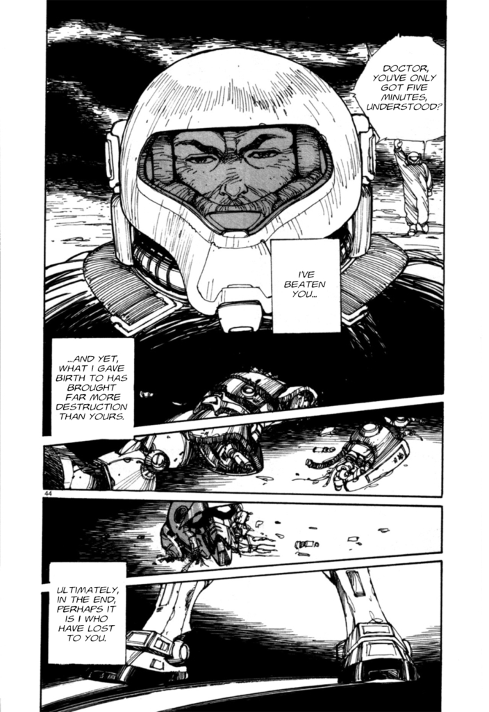 This has a lot of vagueness to it, but here’s how I’ll interpret his words.  The thing that he’s beaten was disproving the previous theory of physics and getting a grasp on atomic power.  His success in achieving what he set out to achieve as a kid after Chernobyl.  But in doing so, he’s created more destruction with mobile suits and in elevating Zeon.  He brought humanity into devastating war, worse than anything we’ve seen in the atomic era and with Chernobyl.  Because of that, Minovsky says that he lost.  He wanted to overcome atomic power and find a way to prevent such disasters as Chernobyl.  He succeeded in overcoming it, but ended up creating worse disasters, even dying to his own creations.